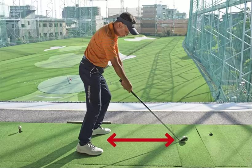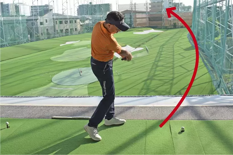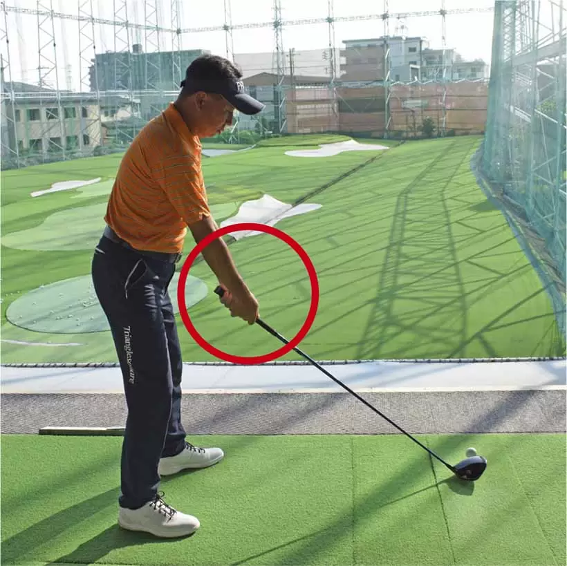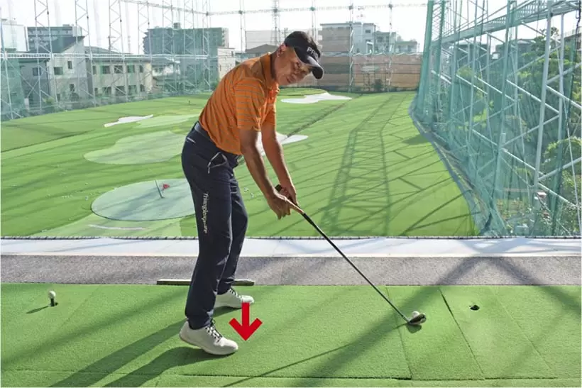 ダウンスイングで上体が目標方向に突っ込まないように注意。