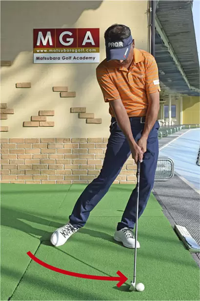 ボールを右足の前に置けば左足上がりの想定練習となる。フォロースルーは高い位置へと振り抜くイメージだ。