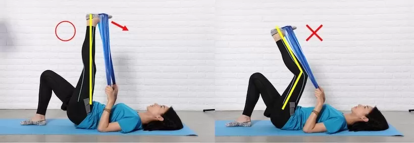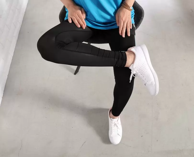 足を乗せるのはこの位置。床についている足は、足首~ヒザ~坐骨を結んだラインが一直線になるように。また、足が床から浮かないように注意を。