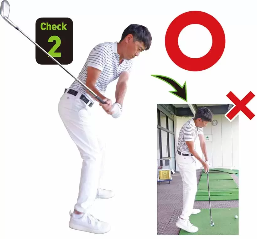 スイング中も上体の前傾角、体とボールとの距離をキープする(左)。上体が起き上がると正確にヒットできない(右)。