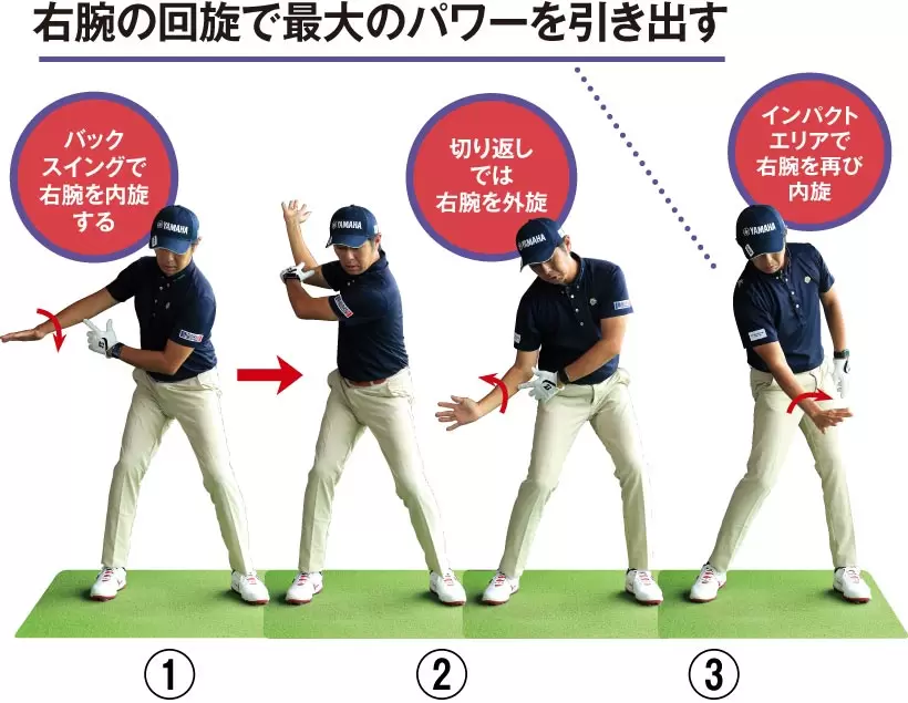 ①自分から見て右ヒジから先を内側に回しながらトップへと上げていく。②トップからダウンスイングを開始する際に右の前腕部を外側に回す③右前腕部を外旋した状態で振り下ろし、インパクトの直前からもう一度内側に回して振り抜いていく。