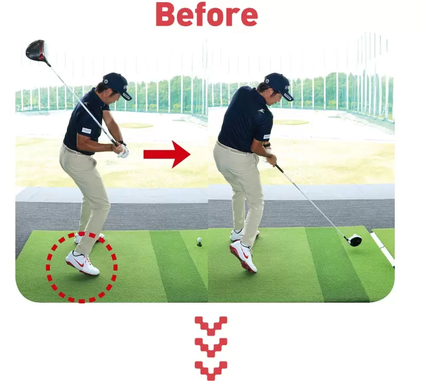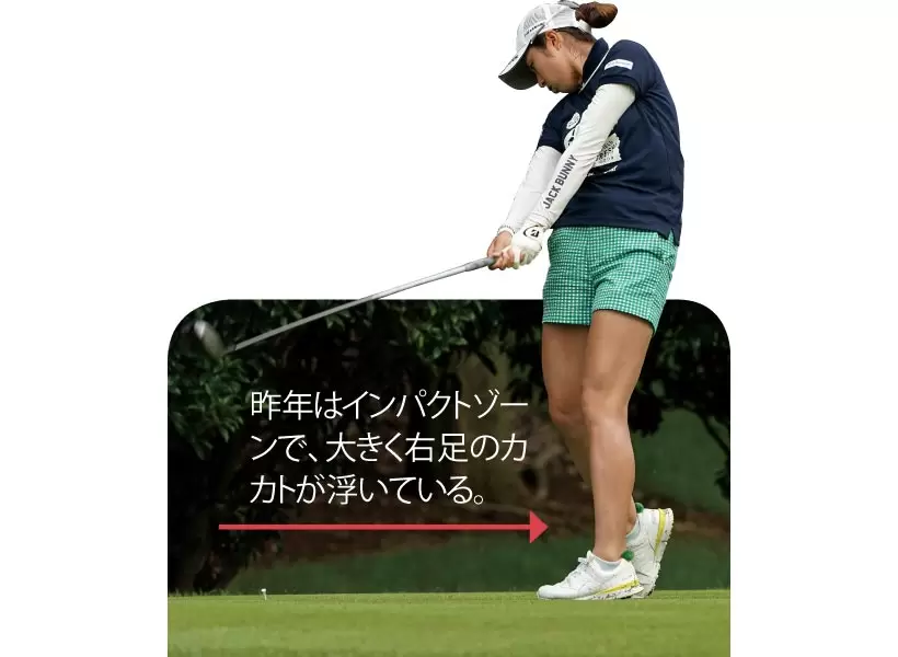 昨年はインパクトゾーンで、大きく右足のカカトが浮いている。