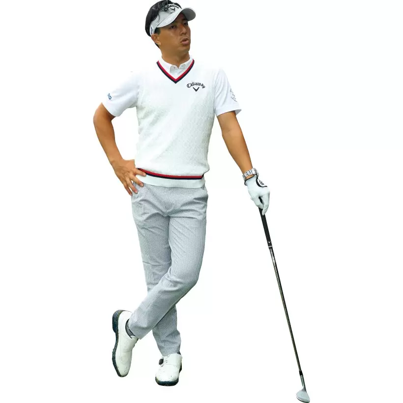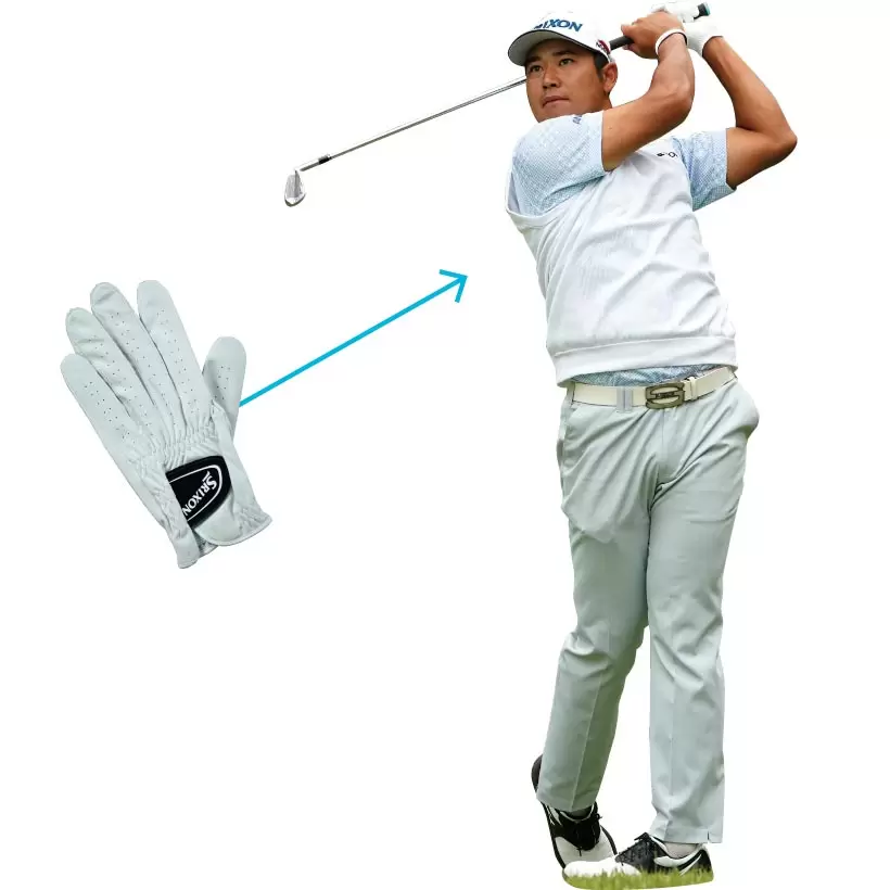 「スリクソン」を身につけて戦う松山英樹。グローブは本革ではなく汗や雨でも滑りにくい人工皮革(クラリーノ)製の『GGG-S024』を使用している。