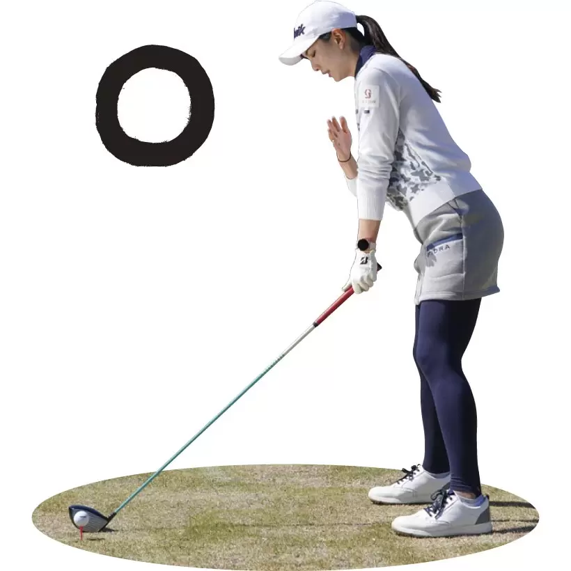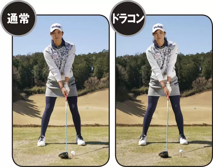 ドラコン仕様のアドレスも、最初からスタンスを広くするのではなく、通常のアドレスを作ってから右足だけを少し広げる。アッパー軌道を意識して、ティも1センチほど高くする。