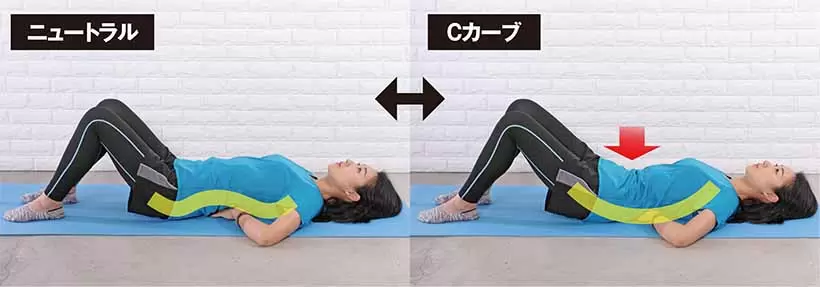 「Cカーブ」は、仰向けになるエクササイズを行う際、腰を守るポジションでもある。就寝時や起床前などに行い、「ニュートラル」と「Cカーブ」のポジションを身体に覚え込ませるとよい。