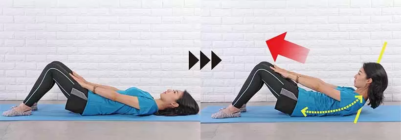 上体を起こす時も床に下ろす時も、背骨の一つひとつを順番に動かしていくイメージ。首や耳と肩の距離を長く伸ばし、リキまずに行う。決して勢いをつけてやらないこと。