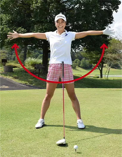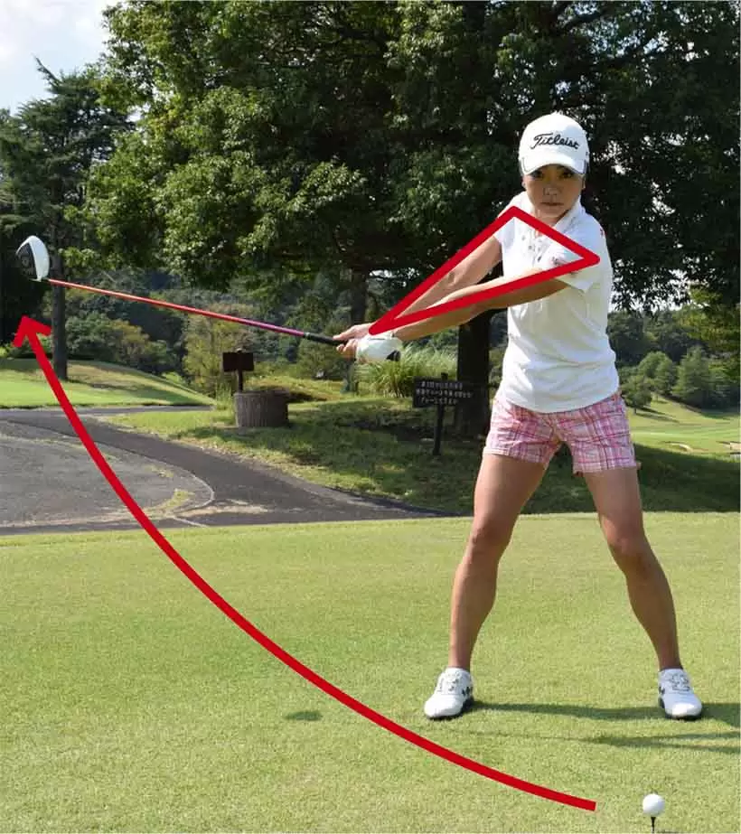 大きなフォロースルーで振り抜くには、バックスイングでも大きく振り上げることが大切なポイント。両肩と両腕の三角形をイメージするといい。