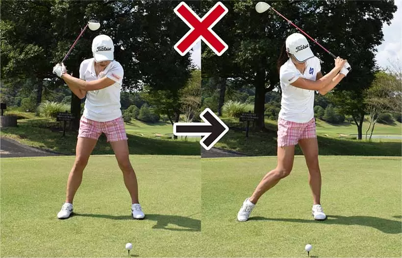 トップで右ヒジが自然にたたまれるが、左腕はできるだけ伸ばしておこう。