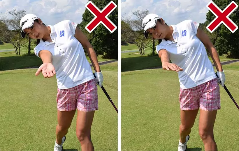 フォロースルーで右手のヒラが上や下を向くとミスショットの原因となる。
