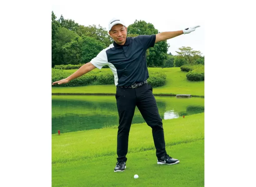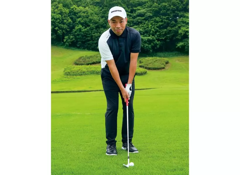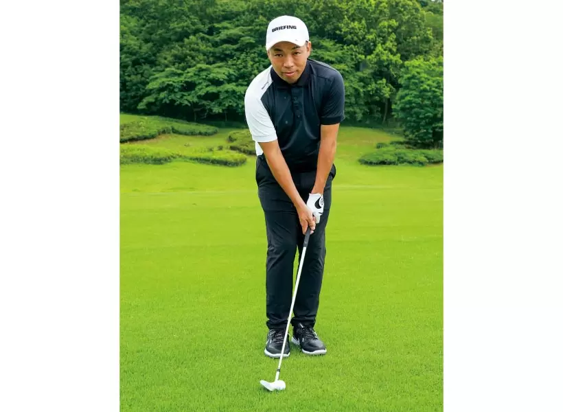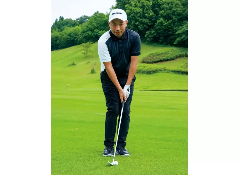 アドレスからフォローまで、内モモはくっつけたまま。