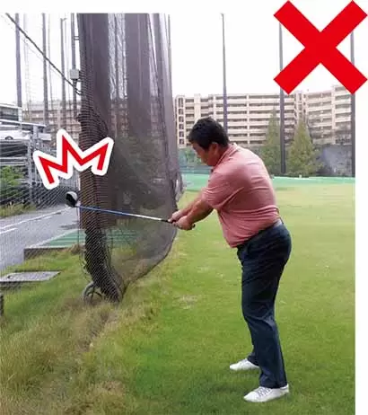 壁、生け垣、ネットなどと平行に立ち、ヘッドがぎりぎりの位置で構える。