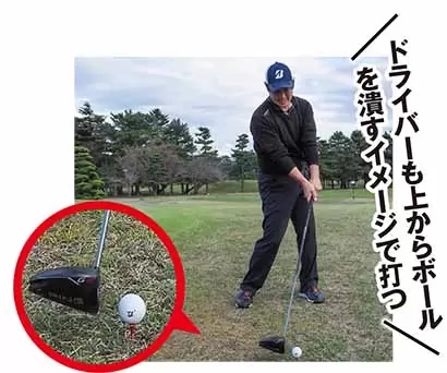 ドライバーでもあおるクセが出るので、ヘッドが下から入らないようにティアップを低くして打ちます。練習場では35ミリのティを使います。球筋は低くなりますがスピン量が適度になり風に影響されにくいので安定して飛距離が出るようになります。