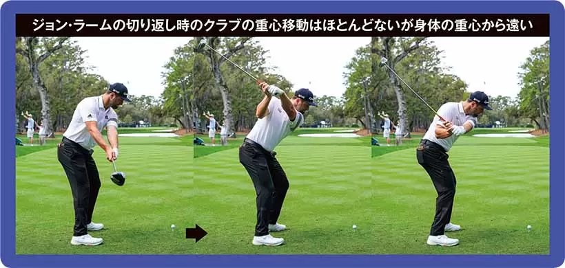 ジョン・ラームの切り返し時のクラブの重心移動はほとんどないが身体の重心から遠い。