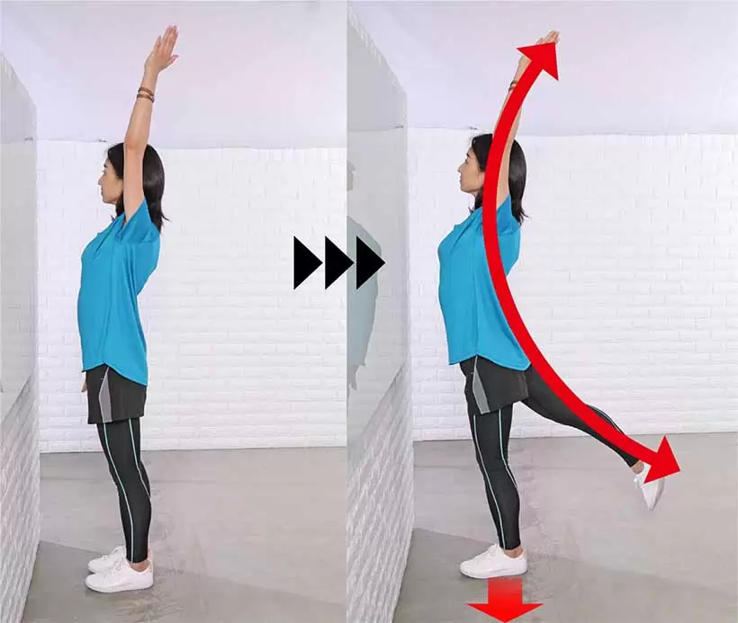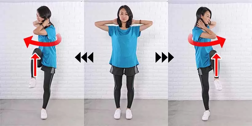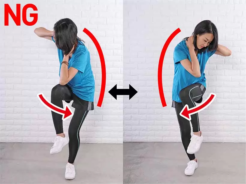 背中が丸まってお尻が落ち、脚が内側に入ったNG例。上げたヒザがヒジを迎えに行くように内側に入るのではなく、ヒザを正面に向ける動きにならないと、効果がない。