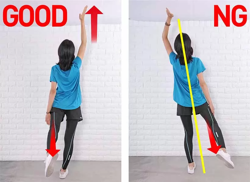 脚は真後ろに引くこと。外側に開かないよう注意。また、上体が前傾しないように気をつけよう。