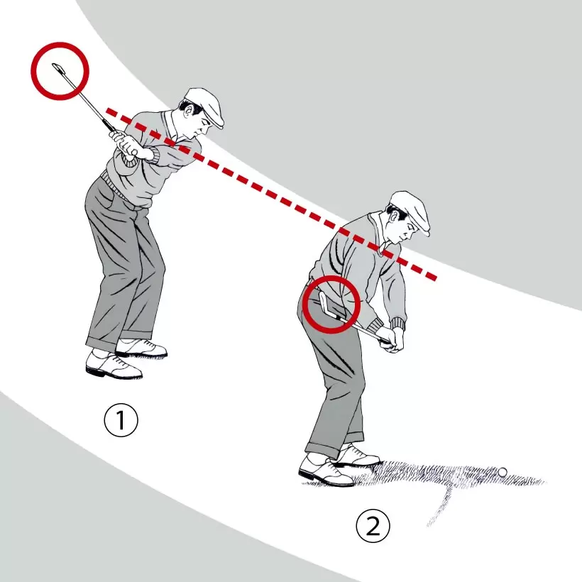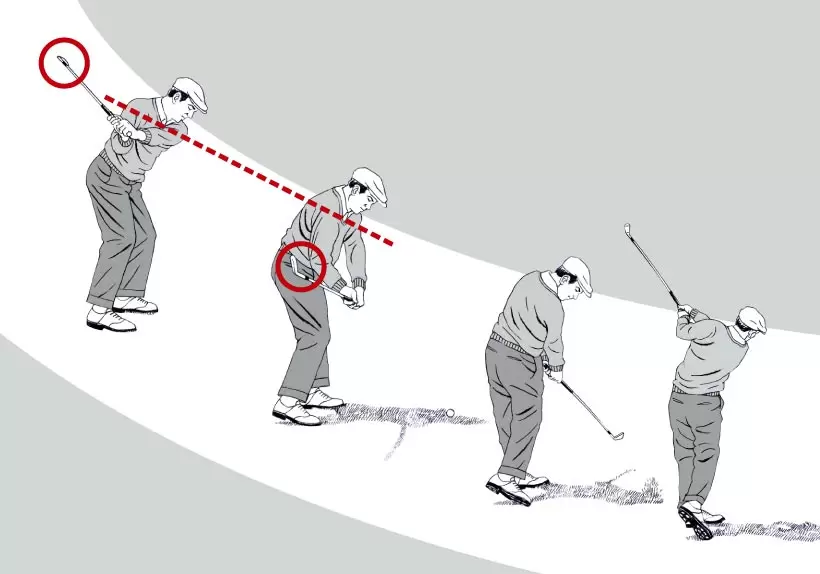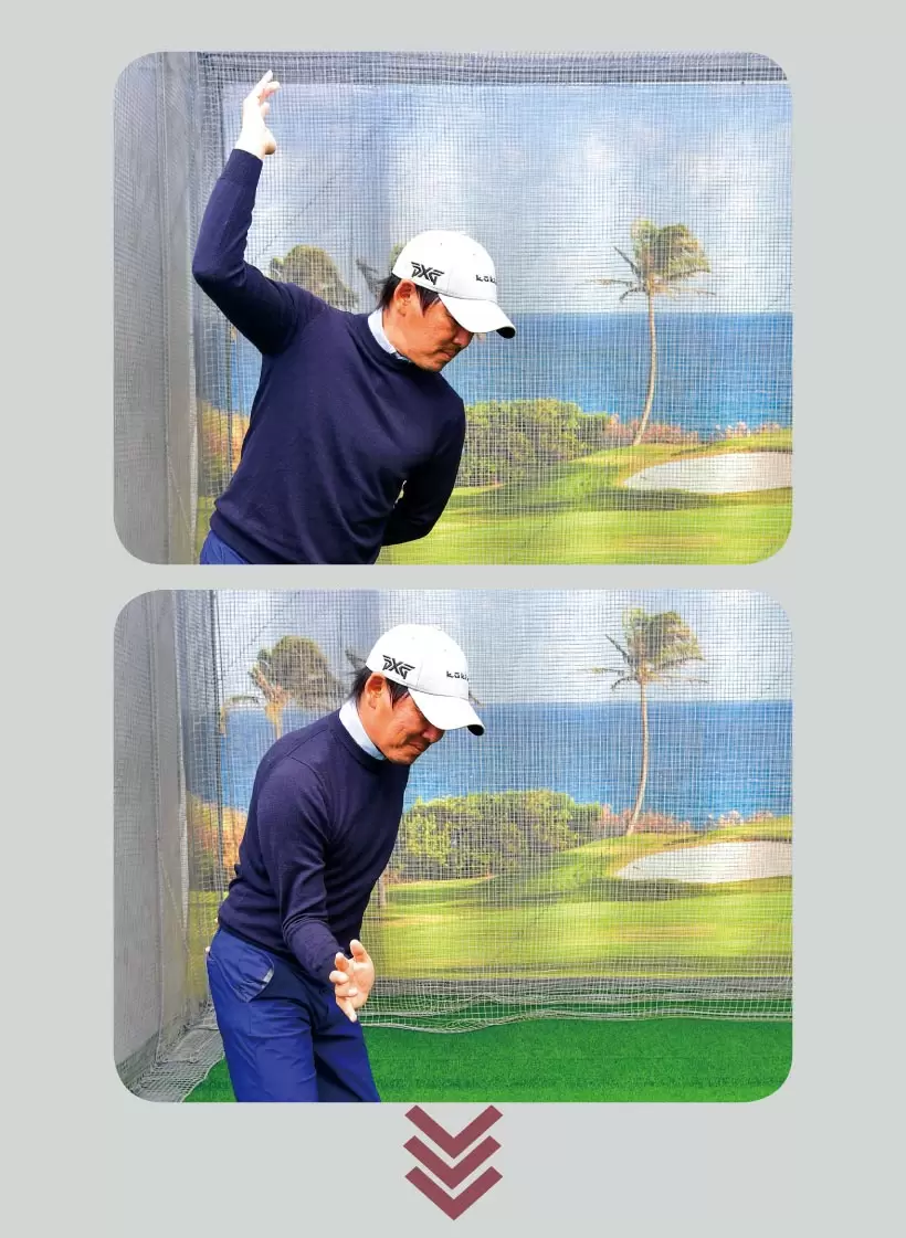 ボディターンに対して動きを合わせきれず、右肩が落ちたり(上)、カット軌道になったり(下)しやすい。