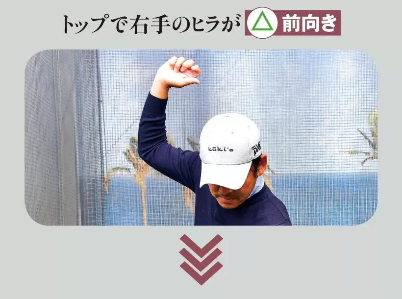 右手のヒラが正面に向いていると、切り返しで手元を真下方向に下げるイメージと動きが必要になる。