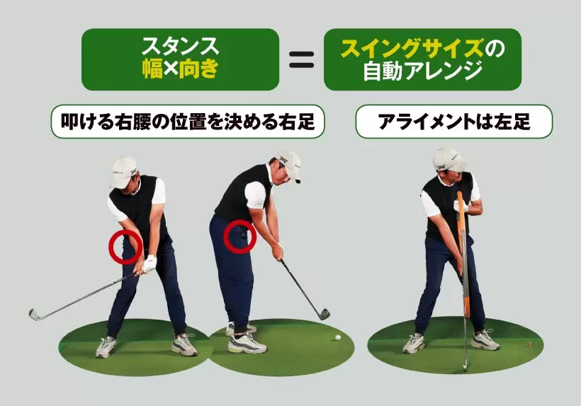 右腰が前に出るほどヘッド軌道は上から入りやすくなる。だからショートアイアンではオープンスタンスにする。