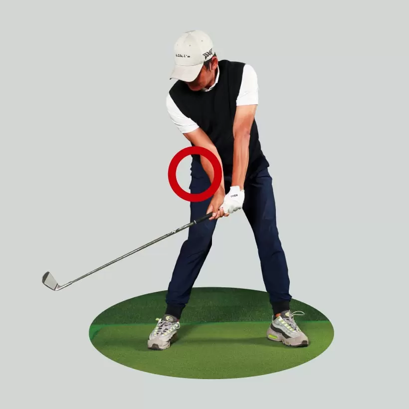 右手でヘッドの近くを持ちスナップ動作を意識しながら腰をターンしてみる。右ヒジと右腰の一体感がつかめる。