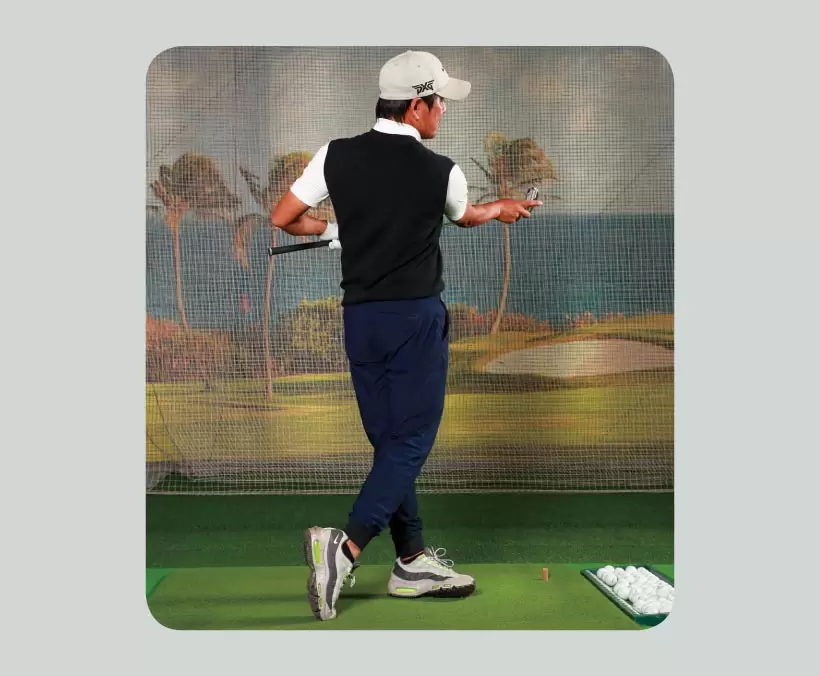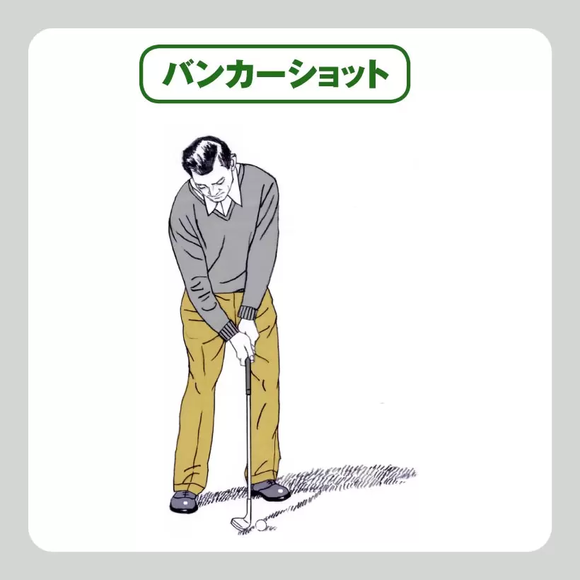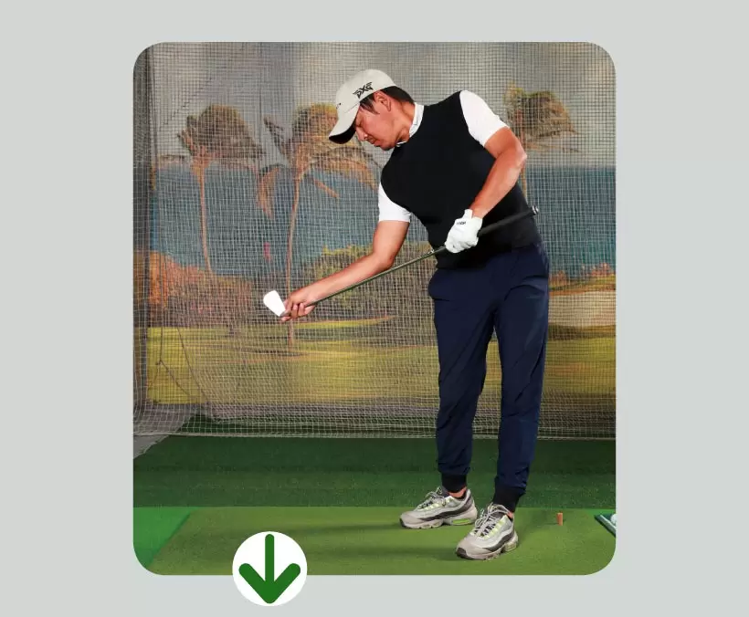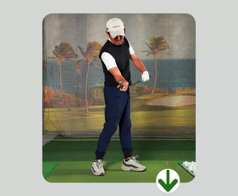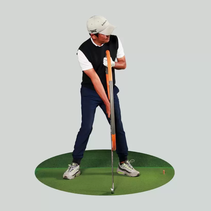 肩もややオープンだがスタンスはさらにオープン。ヘッド軌道は肩のラインなりに、わずかにアウトサイドに振り上げられる。