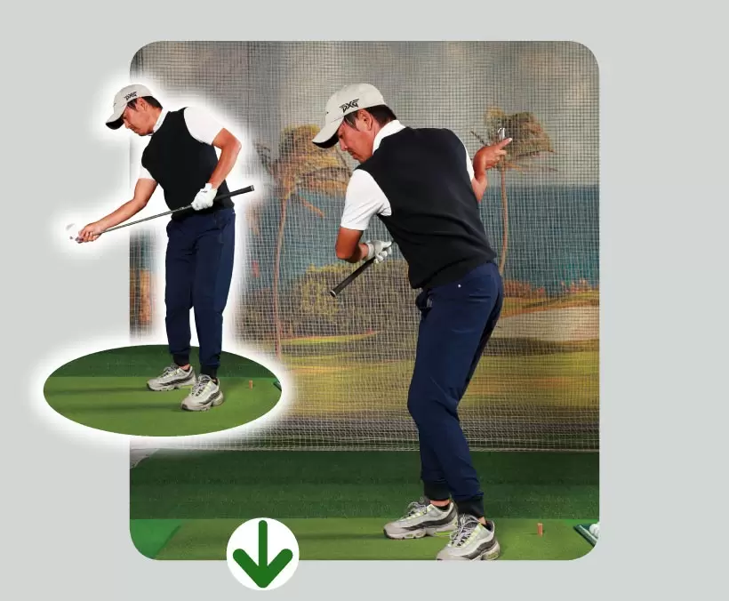 スナップ動作をインパクトエリアで発揮するには、それを支える右腰の位置が大切。右足の置き方でそれが決まる。