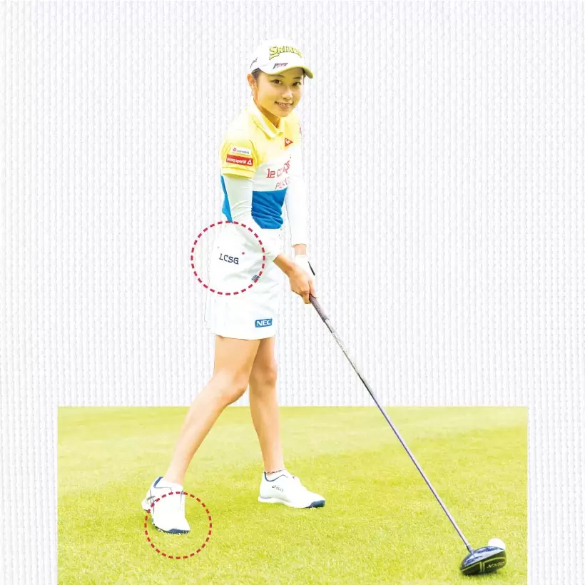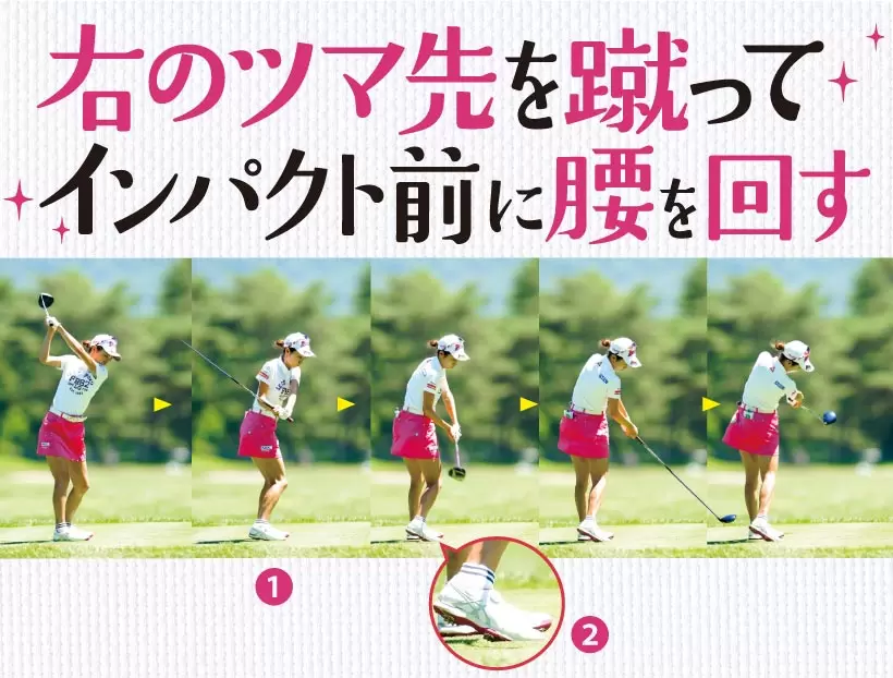 インパクトの瞬間にはフェース面と同じように腰を目標方向を向くまで回転させること。