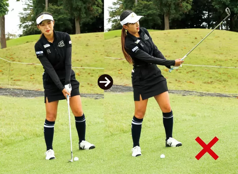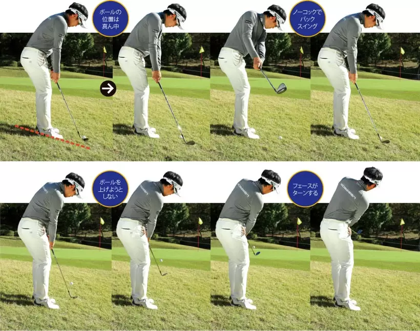 バックスイングではコックしない。距離が伸びたら番手を上げる。