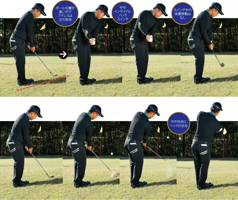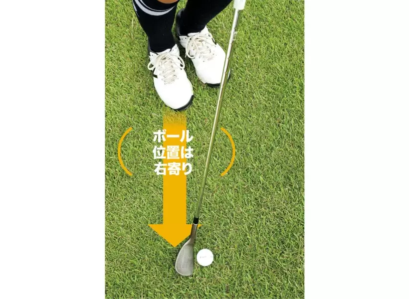 ボールの位置は右足より右。クラブは短く持ってボールの近くに立つ。