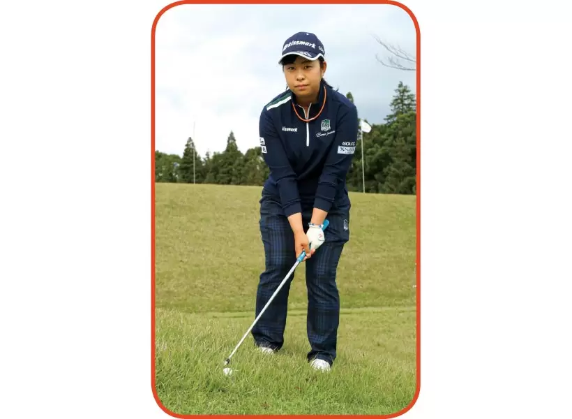 ボール位置は左右センターから気持ち右寄り。左に飛ぶのでフェースは開いておく。