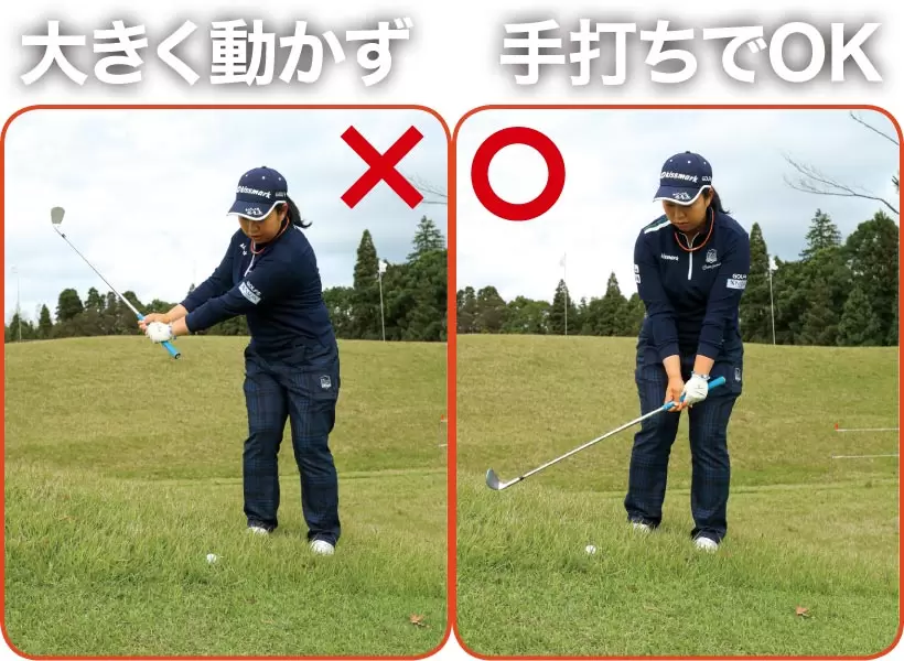体の運動量を小さくしヘッドの運動量だけで打つ。手打ちのイメージでOKだ。