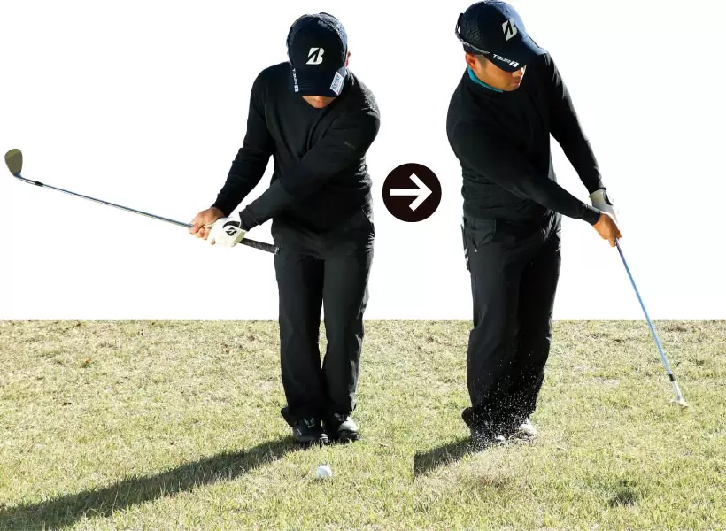 その場でクルッと回るだけなのでインパクトでもアドレス時のハンドファーストが保たれる。