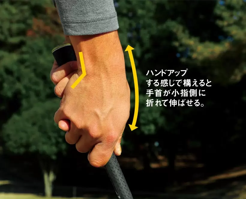 ハンドアップする感じで構えると手首が小指側に折れて伸ばせる。