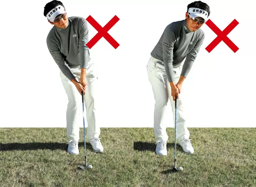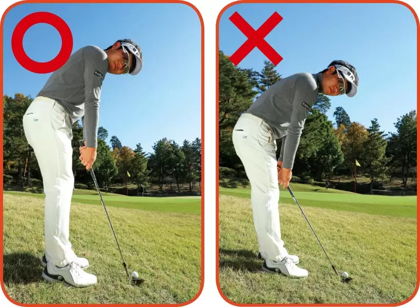 クラブを吊るようなイメージで手首の角度を浅くする。必然的に前傾角度も浅くなる。