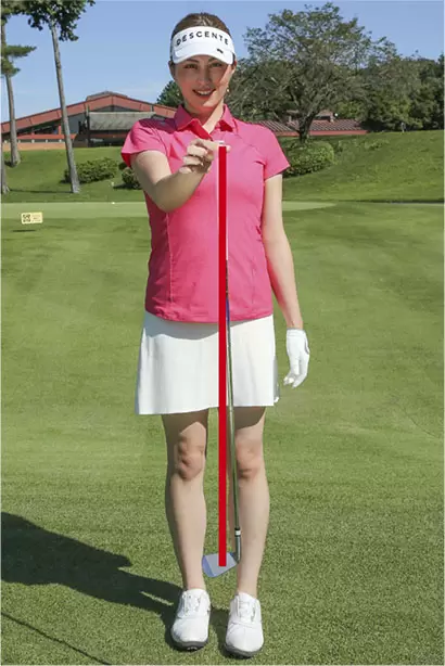 クラブを真っすぐぶら下げてみよう。グリップエンドの中心とヘッドの重心を結ぶ線が垂直となることがわかる。