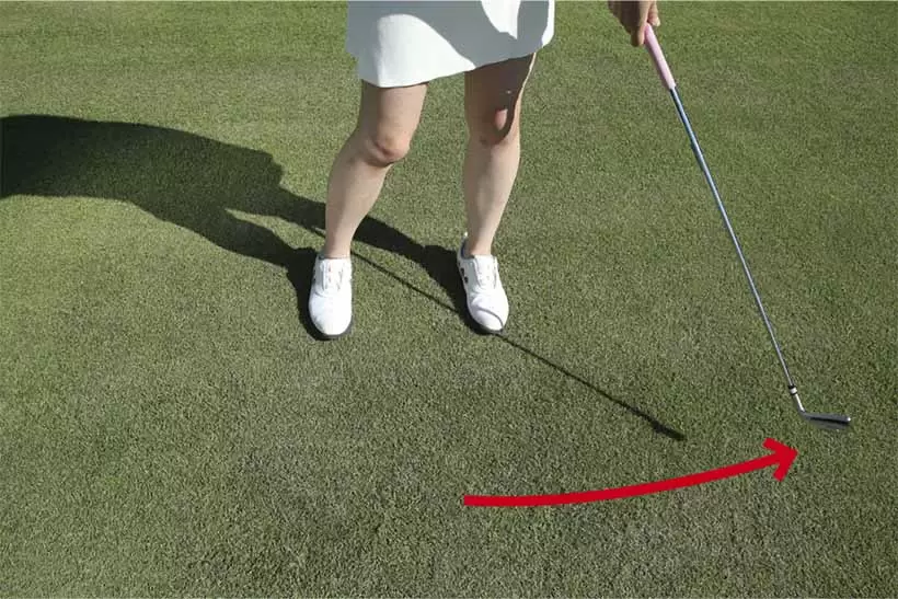 そのままフォロースルーへと出すとヘッドの重心がさらに左に移動し、フェースが閉じてくる。
