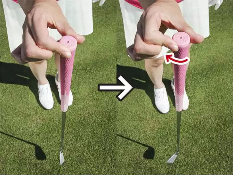 ダウンスイングからフォロースルーにかけてはシャフト軸が左に回転する。