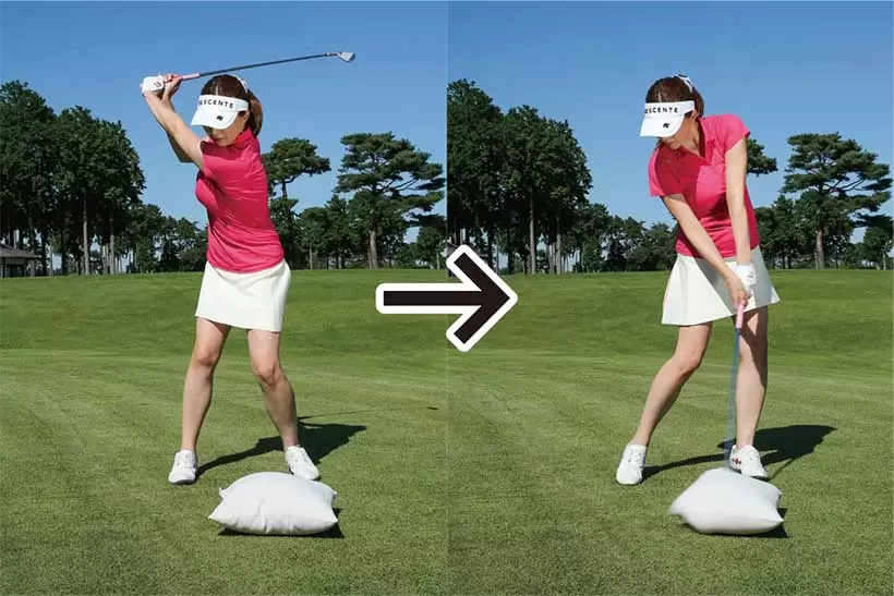 クッションを両手で持ち、アドレスの姿勢を作ってからバックスイングする。