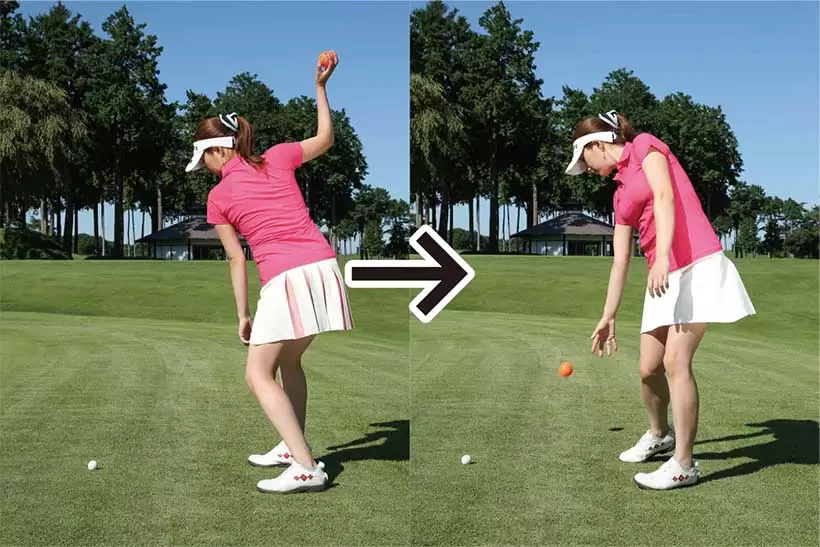 実際のショット練習と同じように地面の上にボールを置く。そして右手にボールを持ってバックスイング。