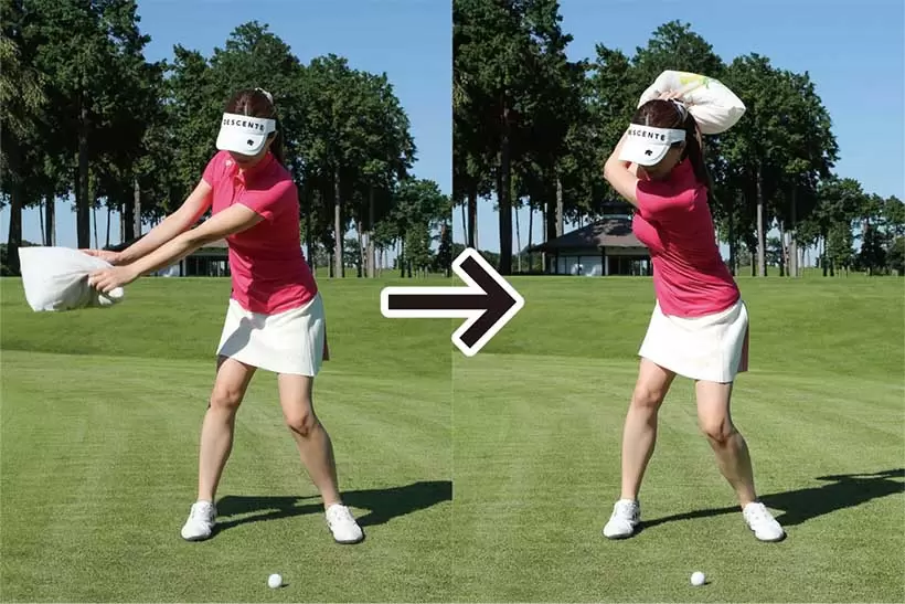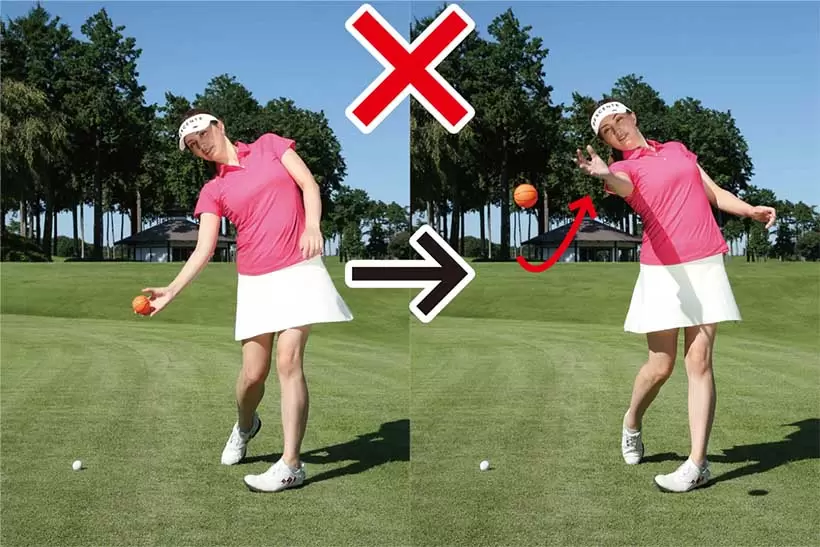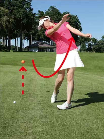 ボールを目標方向に投げるイメージではダウンスイングでカラダが早く開きやすい。正しい動きに見えても、実際はパワー効率がよくないスイングになる。