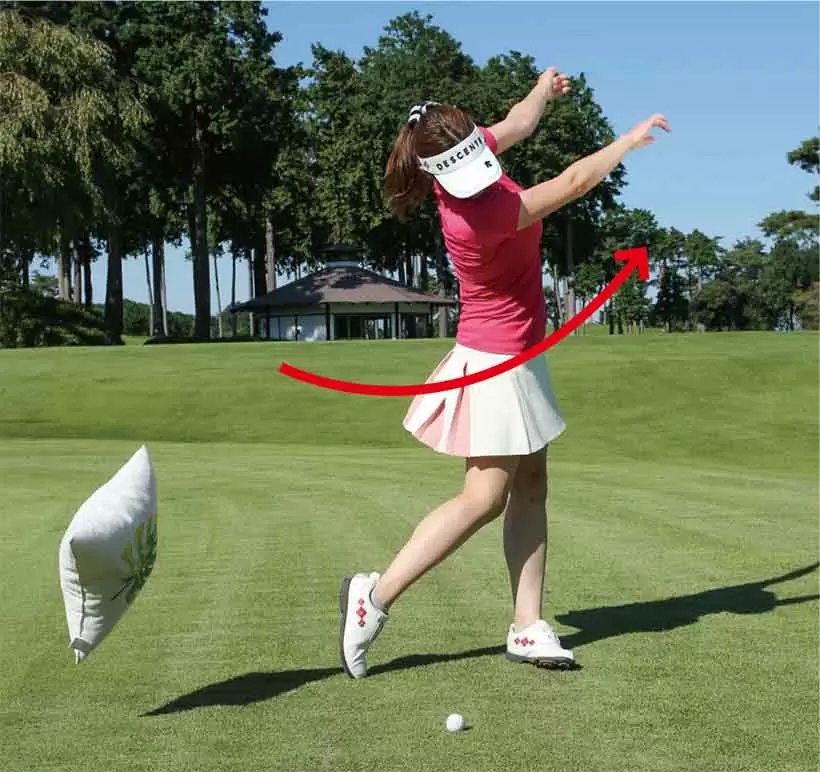 クッション叩きの感覚で手首やヒジを柔らかく使ってダウンスイングする。