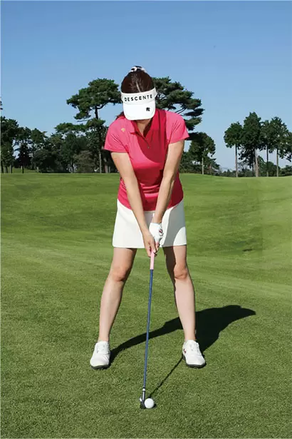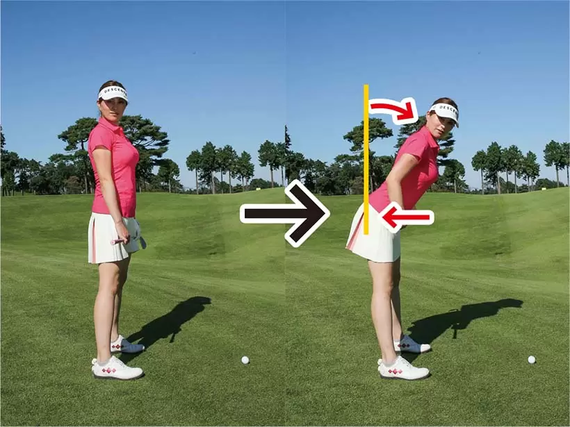バランスのいいアドレスを作るには、背中のラインに沿って骨盤を前傾させて構えることが重要なポイント。