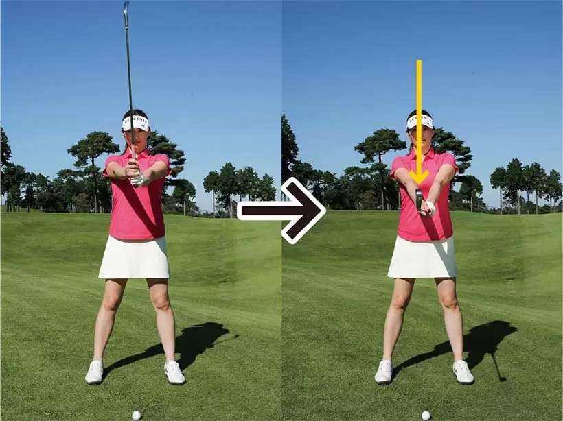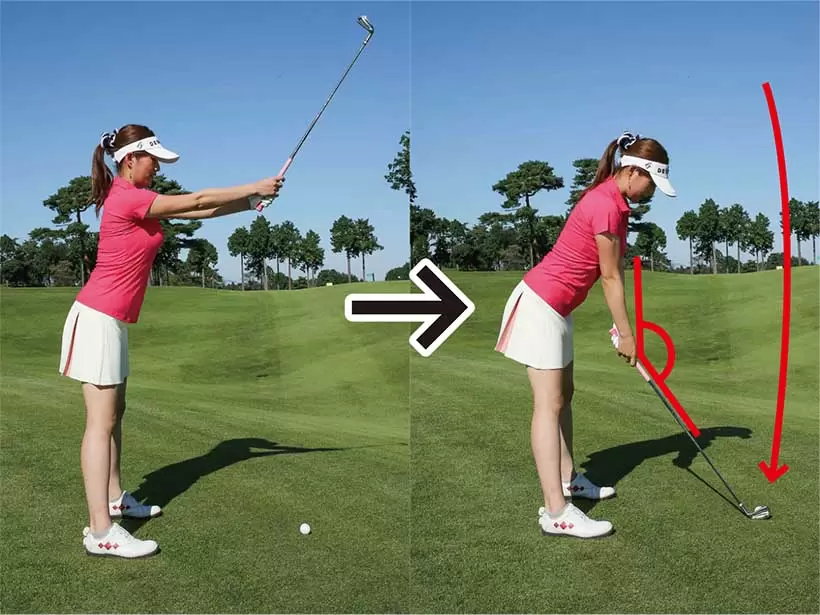 クラブを真上に持ち、上体を前傾させてクラブヘッドを地面まで下ろそう。下ろすときは腕とクラブの角度をキープすることだ。