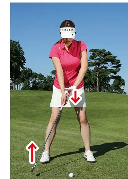 右手を通常にグリップし、左手のヒラを広げてグリップエンドを上から軽く押さえてアドレスの姿勢を作ろう。