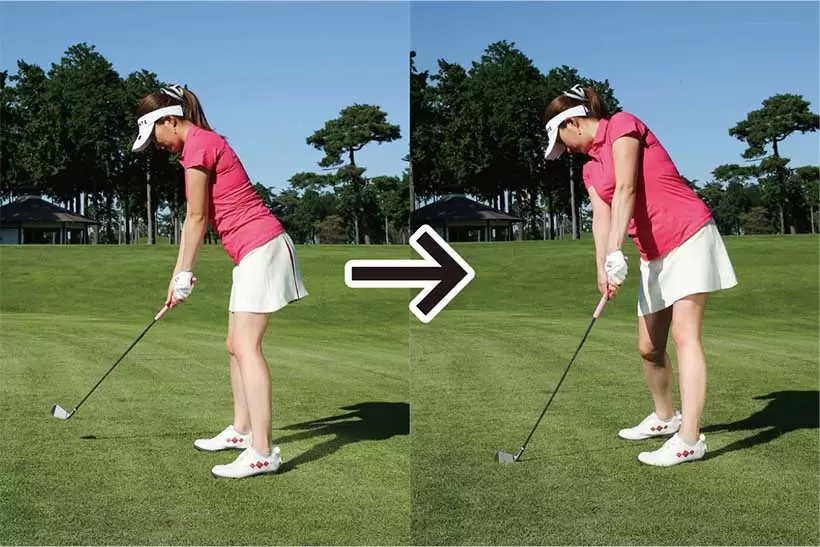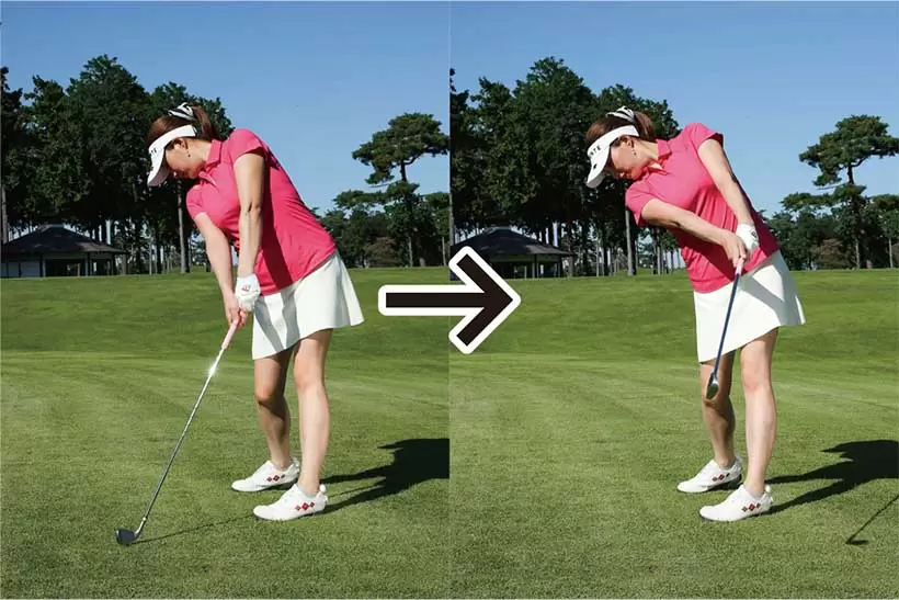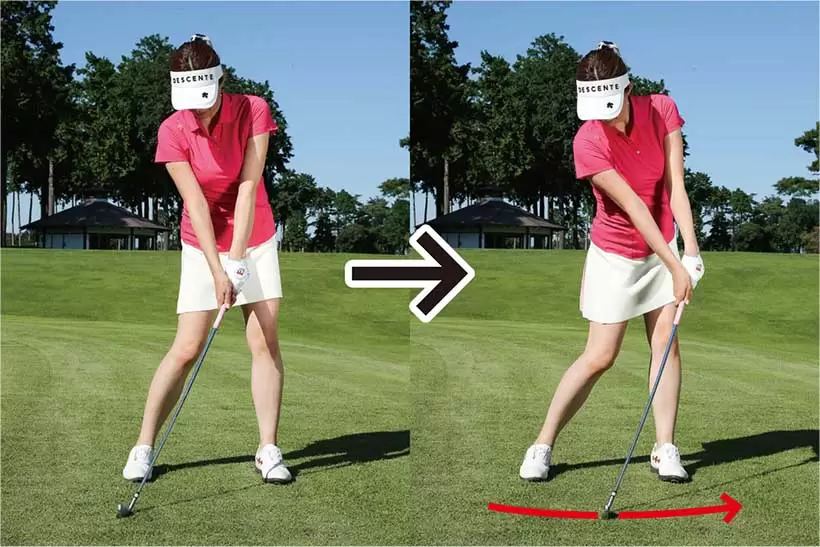 フェース面を強く押せば腰を左に回し、体重を左足に乗るはず。自然にハンドファーストの形が作られる。