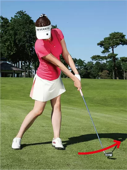 クラブヘッドが緩やかなインサイドインの軌道を描き、フェースが勝手にターンすることがわかる。