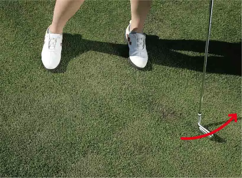 芝の上でクラブヘッドを軽く引きずってみよう。手元を常に先行させることが大切なポイント。