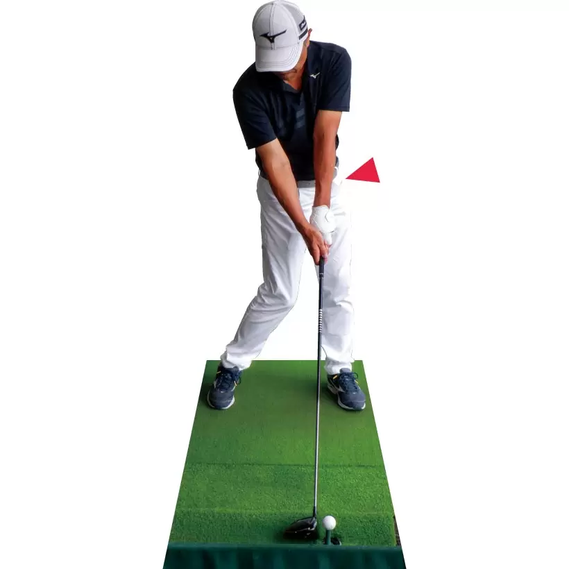 左肩を開かずヘッドの戻りを待ってインパクトすることでスライスが出にくくなる。