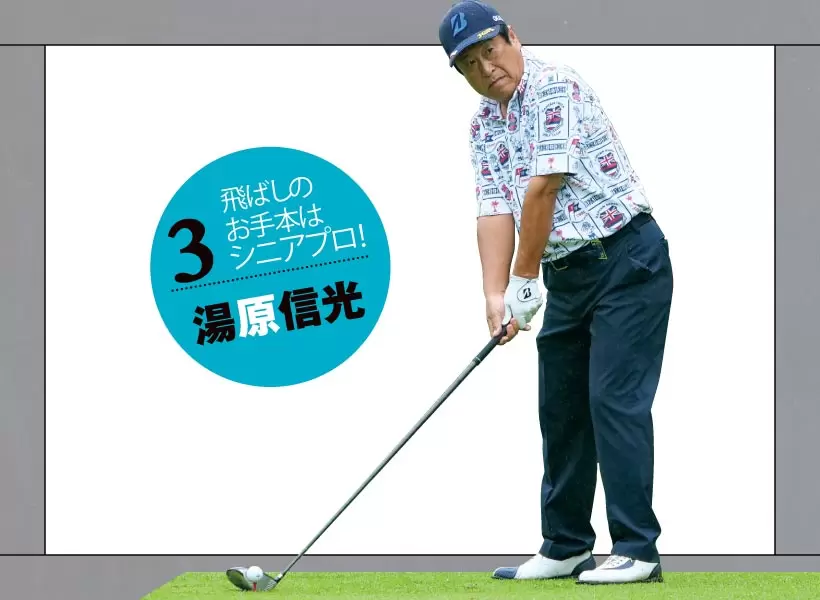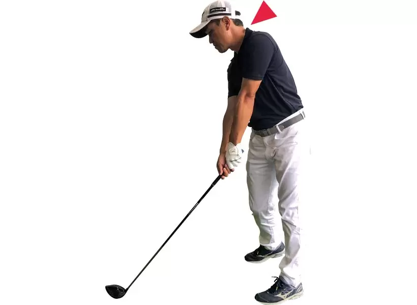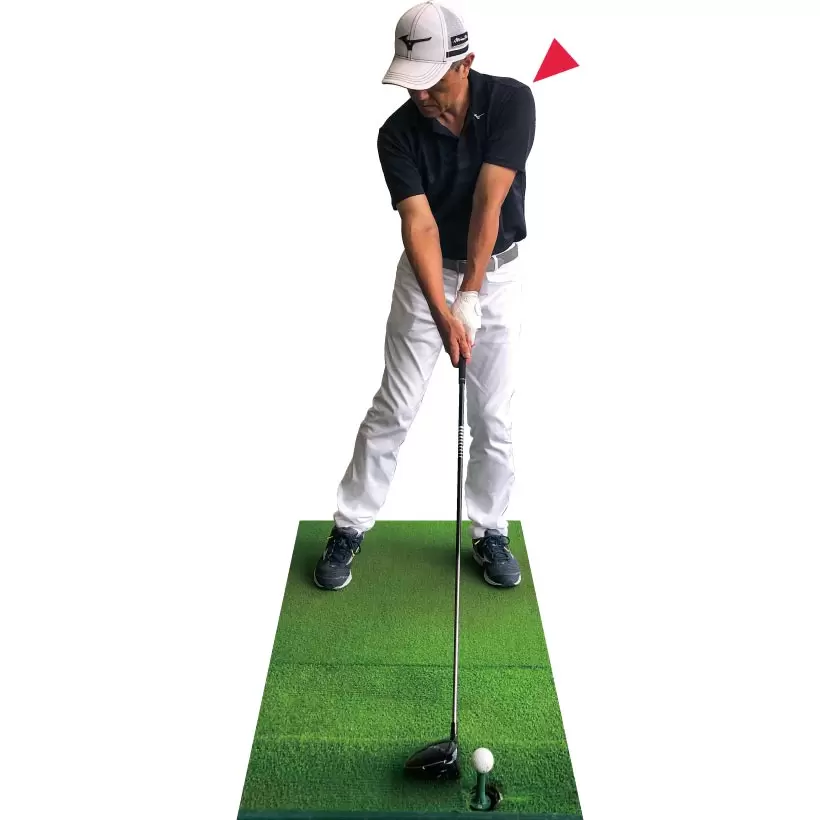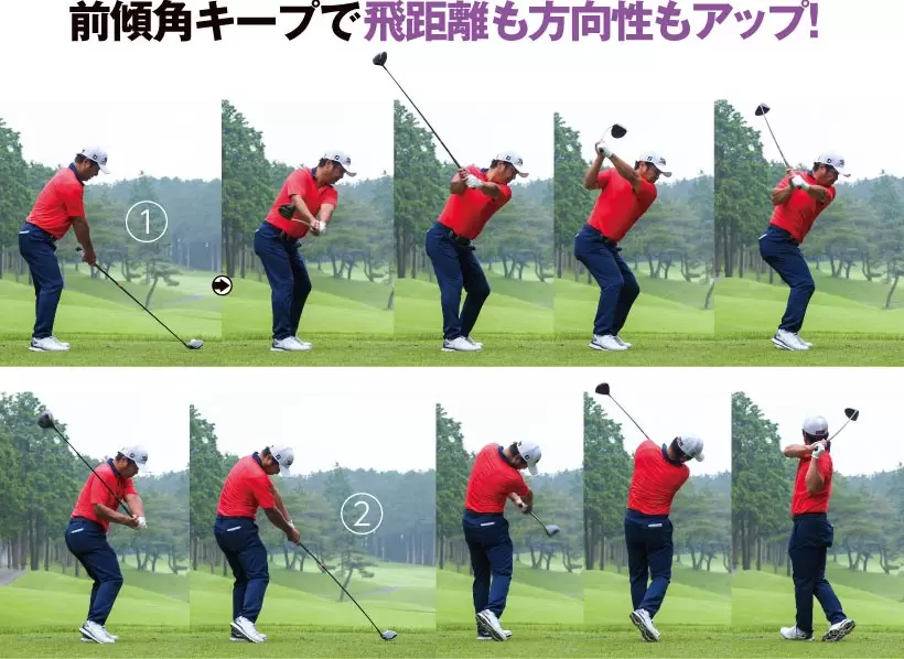 ①高いアドレス姿勢を取ることで余計な力みがなくなる。②打ちに行くと体が突っ込んで頭の位置が下がる。首の長さをキープしたまま振る意識が大切。