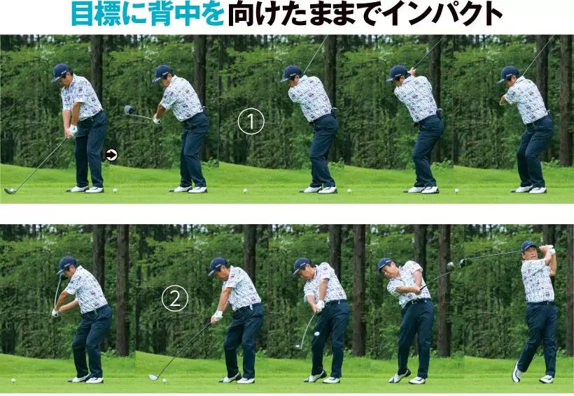 ①体重移動は意識せずその場で回転するイメージ。頭(軸)がブレないからヘッドを速く正確に動かせる。②ヘッドを残したまま手を引き下ろす。浅いトップからでも十分なタメを作ることができる。