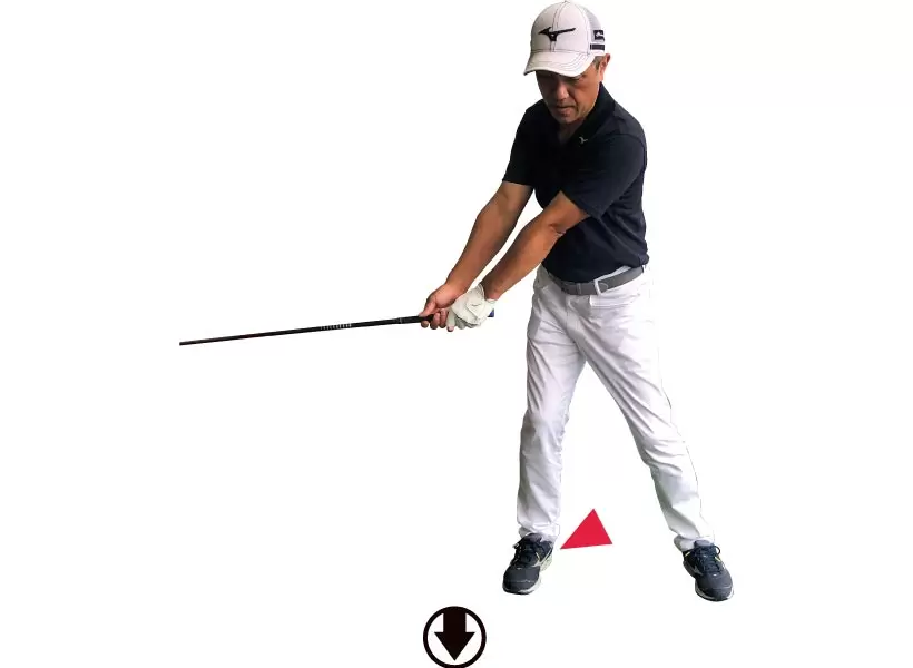 トップで右足体重は遅すぎ。クラブが上がりきる前に左足を踏み込みます。